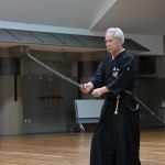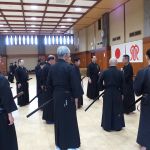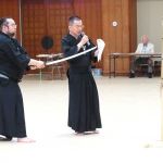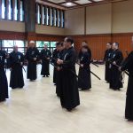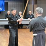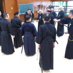 橘園先生による座学のあと、境教務部長による礼法、制定刀法一本目から十本目まで、教本に基づく形演武と解説が行われました。後半は段位ごとの3グループに別れ、菅野会長、境教務部長、柴田先生、猪膝先生が講師となり、受講者に対し、段位別の講習になりました。組太刀形式による解説も行われ、制定刀法の理解が深まりました。