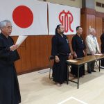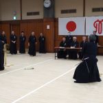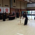 菅野会長、柴田教務部次長の指導による審判講習会が行われました。五段以上を審判員、それ以外は選手として参加。旗の上げ下げ、号令の掛け方、各種ジェスチャーの確認。模擬戦にて、形と抜刀道ワールド大会でも使用された段ボール仮標を用いて、実技の試合の進行から判定の方法まで、細かな指導が行われました。実技模擬戦においては段ボール仮標を用いて行いました。ポイントとして、①指定技違い、②台倒し、③斬り損じ、④所作違い。これらが大きな着眼点となる旨の解説と指導が行われました。